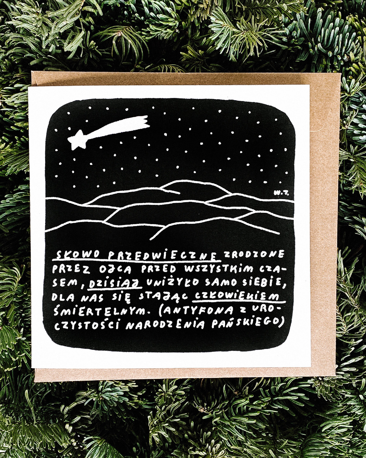 Kartka z Gwiazdą Betlejemską, palestyńskim landskejpem i cytatem z bożonarodzeniowej antyfony.