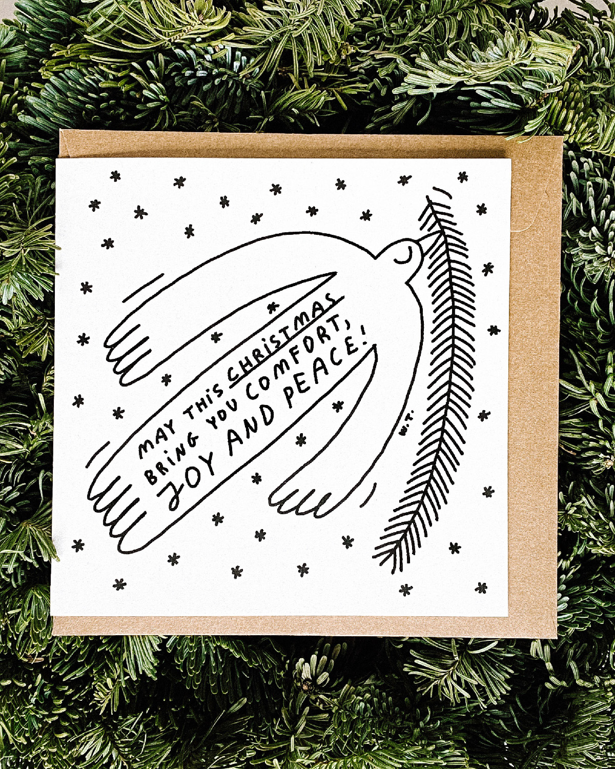 Minimalistyczna kartka świąteczna. Wysokiej jakości druk na przyjemnym papierze w 100 proc. z recyclingu Papier w naturalnym odcieniu bieli, z widocznymi drobinkami, o gramaturze 300 g/m2. Wymiary złożonej kartki: 14×14 cm. Kartka jest pusta w środku. W komplecie brązowa koperta kraft. Czas realizacji zamówienia wynosi 2–3 dni robocze.