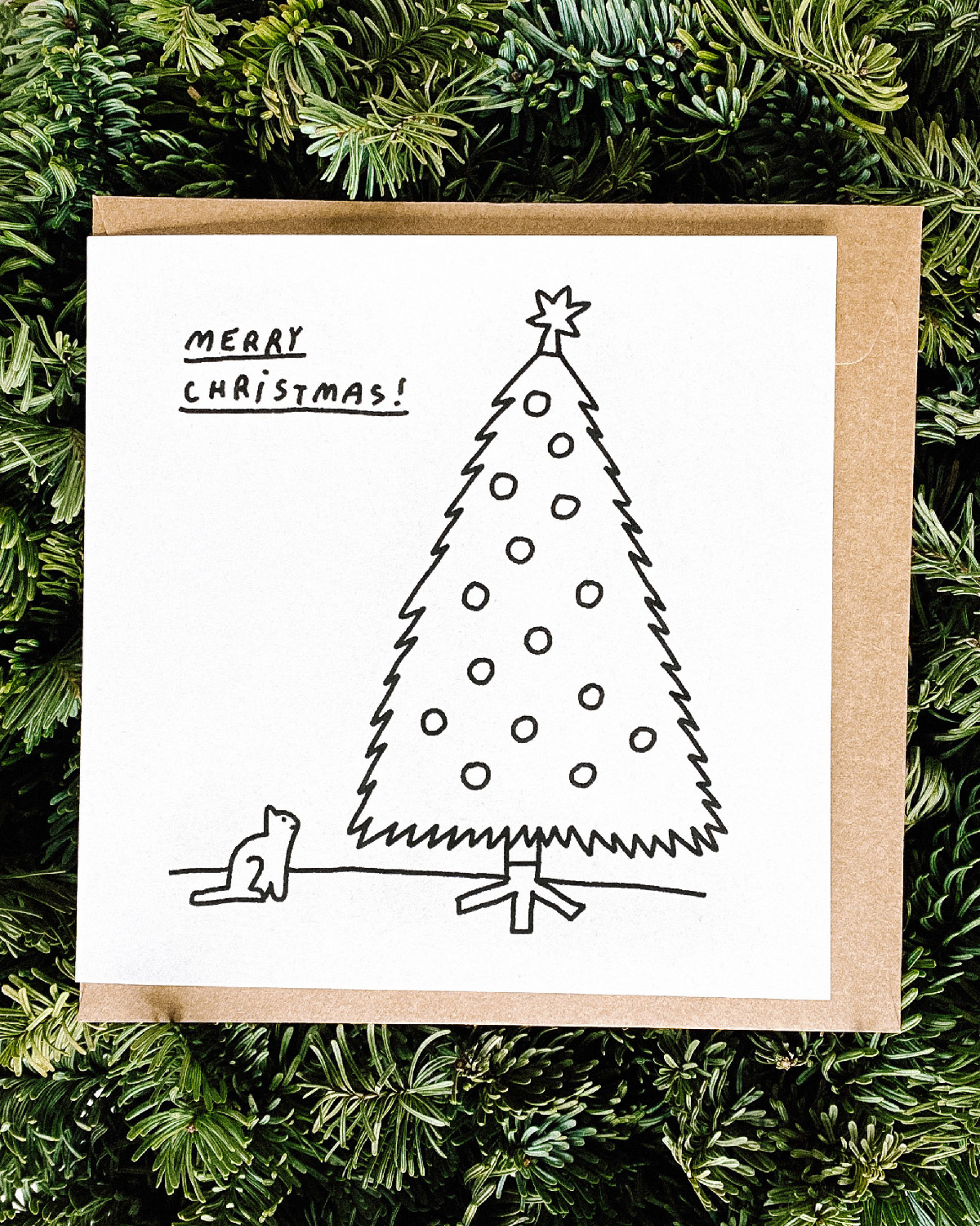 Minimalistyczna kartka świąteczna. Wysokiej jakości druk na przyjemnym papierze w 100 proc. z recyclingu Papier w naturalnym odcieniu bieli, z widocznymi drobinkami, o gramaturze 300 g/m2. Wymiary złożonej kartki: 14×14 cm. Kartka jest pusta w środku. W komplecie brązowa koperta kraft. Czas realizacji zamówienia wynosi 2–3 dni robocze.