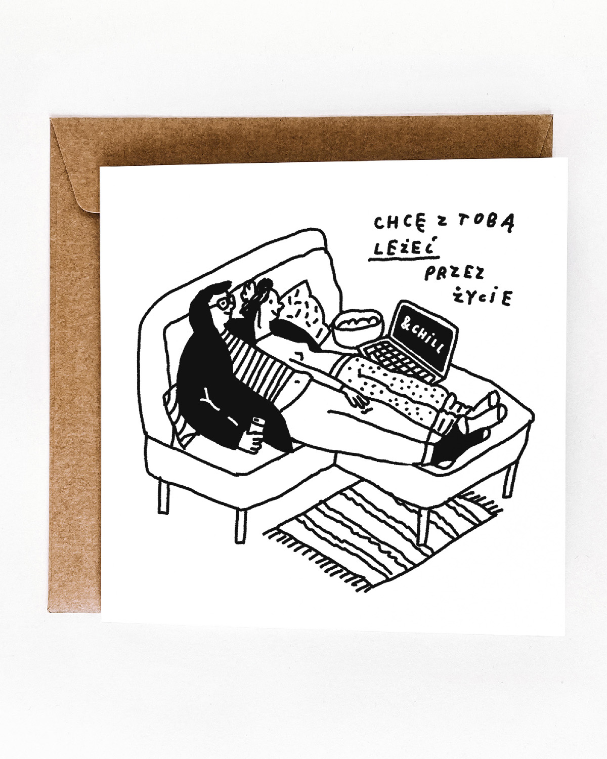 Kartka miłosna dla leniuchów. Co nawet walentynki chętnie spędzą na kanapie.