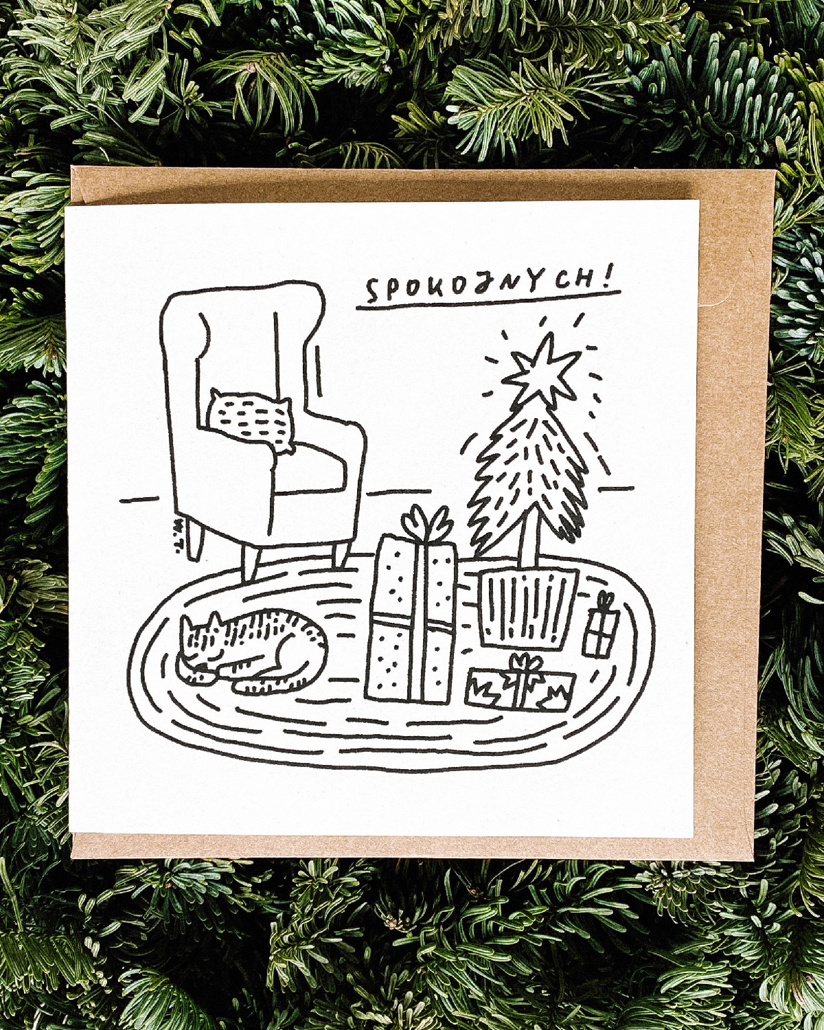 Minimalistyczna kartka świąteczna. Wysokiej jakości druk na przyjemnym papierze w 100 proc. z recyclingu Papier w naturalnym odcieniu bieli, z widocznymi drobinkami, o gramaturze 300 g/m2. Wymiary złożonej kartki: 14×14 cm. Kartka jest pusta w środku. W komplecie brązowa koperta kraft. Czas realizacji zamówienia wynosi 2–3 dni robocze.